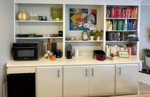 The space features a plush down Cloud couch, a large flat-screen TV, and a cozy fireplace making it the perfect place to sink in, put up your feet and relax. The kitchenette is equipped with a Nespresso coffee maker, mini fridge, microwave and a small dining nook. Enjoy complimentary snacks, fruit and coffee. The bedroom features a queen sized bed with memory foam top, windows and plenty of storage. The bathroom is bright and contemporary with a rainfall shower and high-end toiletries provided for your convenience. Outside, there is a charming patio area, complete with outdoor seating making it the perfect place to enjoy a sunlit morning.