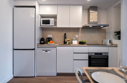 Fully equipped kitchen with oven, dishwasher, washer/dryer, Nespresso machine, fridge/freezer, toaster, microwave, kettle, and all essentials for home-cooked meals.