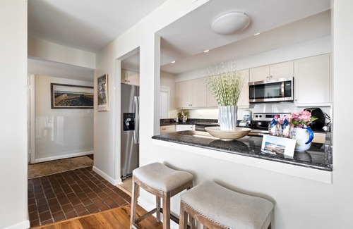 The main space features a fully equipped kitchen, laundry room, dining room and living room. The living room has another Flat screen TV and a sleeper sofa.