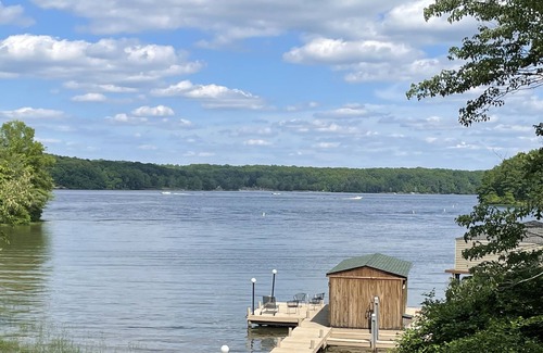 When you aren't admiring the lake views from the dock or screened porch, savor the beautifully forested yard with a built-in fire pit, and high-speed WIFI, and enjoy the game room with your family and friends. After a long day of fishing, boating, or hiking, the house welcomes you with a fully equipped kitchen & outdoor grill, TVs, and games. Relaxation awaits!