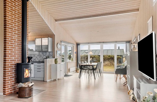 Travel to Vorupör Strand and relax with your loved ones in this inviting and bright vacation home. Come together to cook, eat and play in the open-plan living room and light the wood-burning stove for a cozy warmth in the heart of the house. You won't miss a thing here and can feel completely at home.
