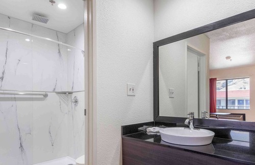 Motel 6 Fremont, CA - South offers 155 accommodations, which are accessible via exterior corridors. Flat-screen televisions come with cable channels. Bathrooms include showers.