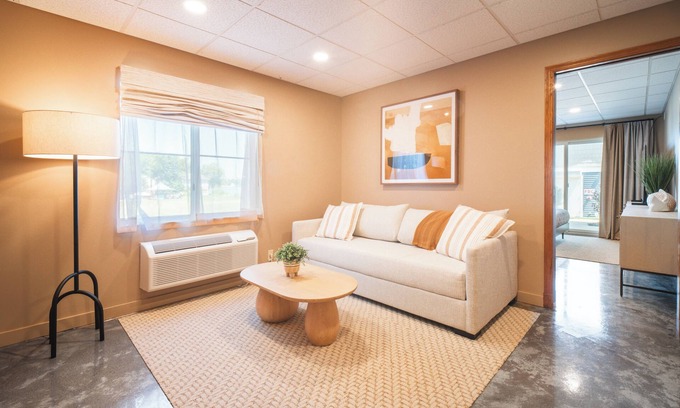 Newly renovated guest suite at Put-in-Bay. Room has a queen bed in the bedroom and pull-out futon couch in living room. This room does not have a lakeview, but it does have a walk out first-floor patio.