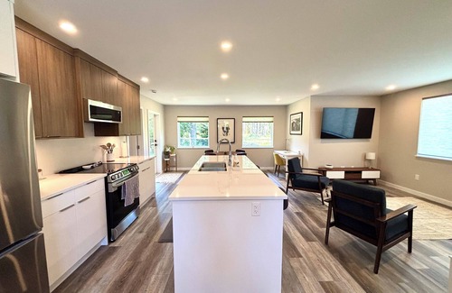 This brand new 2025 built home has just been completed and outfitted with all brand new furnishings and decor. There is ocean and mountain views and the home is located adjacent to our hobby farm with goats and chickens. There is a master bedroom with a smart tv and an ensuite bathroom. The second bedroom is located beside the full bathroom (with a bathtub) down the hall. The open style well equipped kitchen is amazing for cooking meals with a large island for gathering with family or friends. The home also has an outdoor covered private patio with comfortable patio furniture, barbeque and a propane fire pit for you to enjoy. There is lots of parking on the premises and a carport for your convenience and storage during your stay. The yard has been landscaped recently, but due to the hot weather the grass seed did not fully grow in. Some sections of the yard are incomplete.