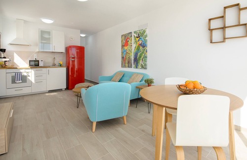 INCLUDED IN THE PRICE : ACCESS TO THE FARIONES SPORTS CENTRE WITH HEATED SWIMMING POOL, GYM, SAUNA AND SUPERVISED ACTIVITIES.Great newly renovated holiday home just 200 meters from the beach. 1 bedroom, fast and free WiFi and access to the community pool and all the services of the Fariones sports center, located right in front of the accommodation. Perfect for couples.-Red Volcano is ideally located in the center of Puerto del Carmen, with all services (supermarkets, bars, restaurants, beach bars, pharmacies, banks and shops) and the beach just a few meters from the apartment. Its location is ideal to spend a holiday enjoying all the comforts without needing a car.This modern and charming first floor home consists of 46m² and is decorated with an exclusive design. It has a living room, kitchen, a double bedroom with single beds and a bathroom with a shower.The beautiful living room offers a comfortable sofa, air conditioning and heat pump, Smart TV with satellite channels and free high-speed Internet with 600MB Fiber Optic. In addition, it has a charming and intimate dining space.The kitchen is fully equipped with a ceramic hob, oven, microwave, coffee maker, tea maker and electric juicer, refrigerator and complete kitchenware. Red Volcano also offers a bathroom with a shower and a beautiful double bedroom with single beds. You can park for free on the street.It is key to mention that right in front of the house, just 10 meters away, is the Fariones Sports Center, a large space with gardens and facilities such as a gym, swimming pool for adults and children, various tennis and paddle tennis courts and an area outdoor crossfit. In the apartment you will find a numbered card that gives unlimited access to said center to all registered occupants.All its facilities can be used free of charge, except for the tennis court, which will have to be reserved and paid for directly at the sports center. Likewise, you can attend all the directed classes taught at the center.The pool is heated all year round at a temperature of 26ºC. The center's hours are Monday to Friday from 7am to 10pm and Saturday and Sunday from 8am to 3pm.