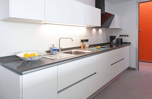 In the induction open plan kitchen, refrigerator, microwave, oven, freezer, dryer, dishwasher, coffee machine, toaster, kettle and juicer are provided.