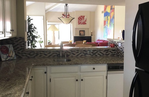 The roomy kitchen has lots of beautiful granite counter space, and a bar sink in addition to the double kitchen sink. There is a reverse-osmosis (RO) purified water system that supplies the ice maker and a separate faucet for drinking water. The kitchen is well supplied with dishes, glassware, wine glasses, tableware, & cookware to meet your needs, and plenty of cupboard space. A starter supply of paper products & a few spices are provided. All appliances, coffee maker, hot water kettle, blender, mixer, toaster, cookie sheets, plastic ware for the pool, salad & mixing bowls of various sizes, & serving dishes are all waiting for your use.