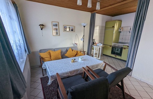 The approximately 45 m² apartment with a hall, living room, shower room / WC and two bedrooms is suitable for 2 adults with up to 2 children. It is centrally heated, the floors are tiled and have carpets. Bath and double rooms adjoin the living room. Through the double room (connecting room) you reach the second bedroom (nursery). In the children's room carpets and a bunk bed (2x 80x190cm), towels, kitchen towels, bed linen are provided and changed weekly. The apartment has a living room to open towards colored fitted kitchen. Coffee maker, kettle, egg cooker and toaster. Crockery, cutlery, glasses, pots, etc. are available for 8 people. The apartment has a separate entrance, in the hall is a cloakroom. The large garden with garden furniture, deck chairs, tables and beach chairs invite you to linger. The sitting area with brick barbecue and the covered pavilion can be used by you - on request - happy with. You can rent simple bikes for free from us. If you wish, we can provide you with drinks and other groceries so that you are groomed for the first day and do not have to shop immediately. In this apartment are 2 pets welcome.