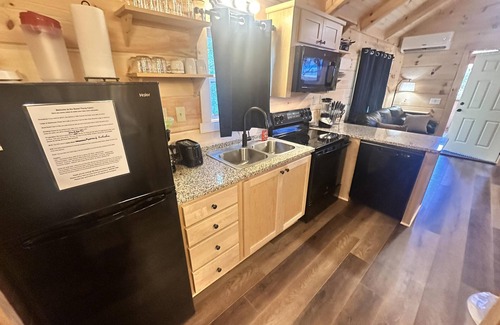 The Sweet Thang cabin has log decor throughout. There is a couch in the living room along with end tables. The bedroom has a King bed with cotton quilt. Cell phone service is Great and the WiFi is super fast in this cabin. Most guest are able to use WiFi calling also while at these. The private, covered porch has a four person hot tub, gas grill, two rocking chairs, and a table. This cabin has a longer range view in the winter time and has a wooded view in the summer time.. This cabin is pet friendly!!! The Sweet Thang cabin is just perfect