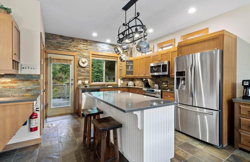 The back of the home has a deck/patio area that can be accessed from three areas indoors (the kitchen, master bedroom, and third bedroom), and has the BBQ, a propane fire table that your group can cozy up around, and the private hot tub to soak in after a long day of adventure.